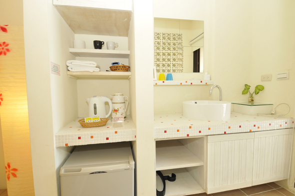 簡單素雅的白底,可看到牧場的衛浴泡湯間,房間和衛浴都以花和蝴蝶為主題,寬敞露台可遠望星空。